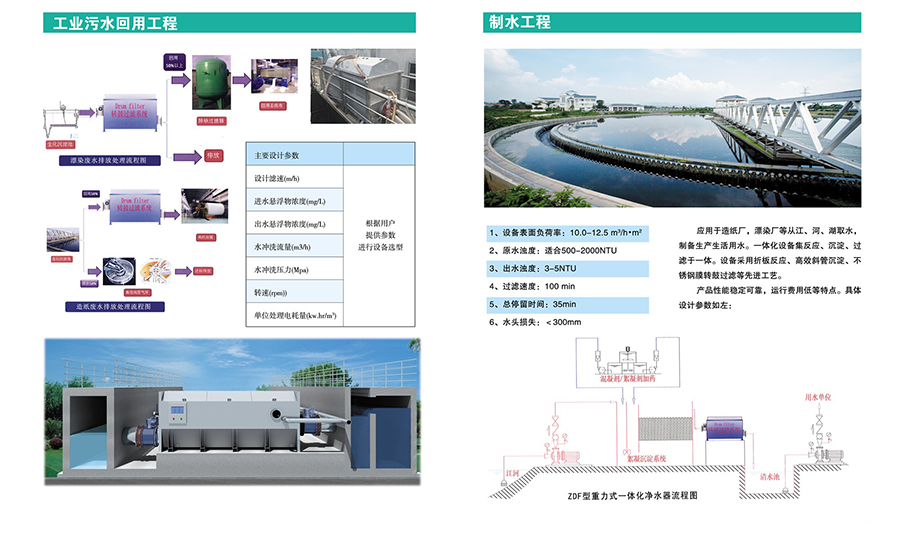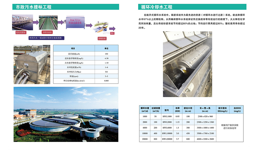 設(shè)備為連續(xù)過濾,當(dāng)滾筒內(nèi)有水進(jìn)入時,自控系統(tǒng)將啟動驅(qū)動系統(tǒng)驅(qū)動滾筒轉(zhuǎn)動,同時啟動反沖洗泵。滾筒開始緩慢轉(zhuǎn)動,反沖洗泵抽取濾后出水對濾網(wǎng)進(jìn)行反沖洗。沖洗下來的顆粒物質(zhì)由設(shè)備內(nèi)部的反沖洗水收集槽收集,并通過排污管排出設(shè)備。反沖洗的同時,過濾正常運(yùn)行。當(dāng)無水通過設(shè)備時,設(shè)備將自動停止。