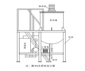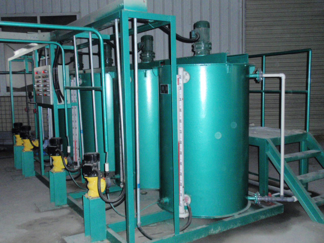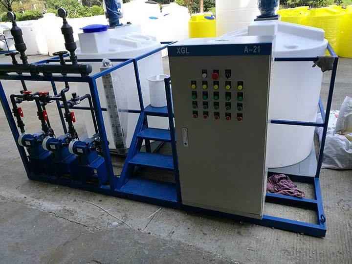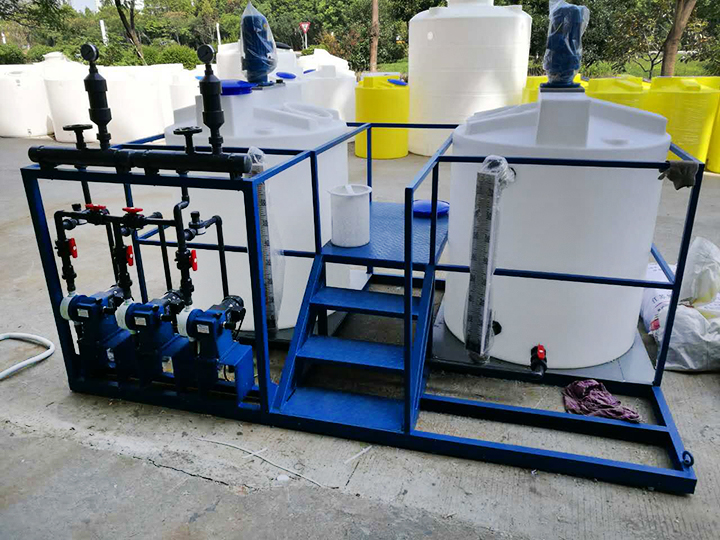 加藥裝置由溶液罐、若干法蘭、閥門等組成。配置兩臺計量泵,一用一備,這樣方便用戶在不停機狀態(tài)下進行檢修、更換配件。