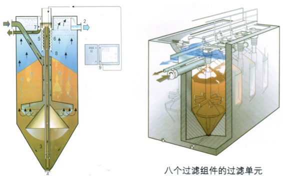 活性砂過濾器采用逆流原理。待處理的水從設(shè)備底部的入流分配管(1)流入,向上流經(jīng)濾床而被過濾,然后向頂部的濾液出流口(2)流出。含有待處理雜質(zhì)的濾砂從設(shè)備錐形底部(3)被空氣提升泵(4)提升到頂部的濾砂清洗器(5)。濾砂的清洗在提升泵中就已經(jīng)開始,在紊流混合作用下雜質(zhì)從砂粒中分離出來,臟砂從泵的出口溢出并進(jìn)入清洗器曲徑通道(6),在那里砂被小流量的清水逆流沖洗干凈,雜質(zhì)通過洗砂水出口(7)排出,而清洗后的砂粒(較重)又返回砂床(8)。結(jié)果是砂床在設(shè)備中不斷的做緩慢下沉運(yùn)動(dòng)。提升泵用壓縮空氣通過空氣分配器提供(9)水的凈化與砂的清洗同時(shí)進(jìn)行,因而過濾器可以不受干擾地連續(xù)進(jìn)行。
